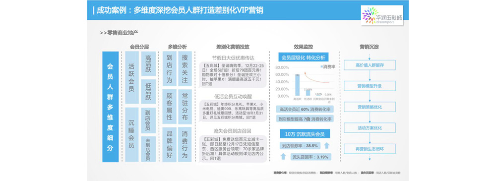 华润集团旗下的北京五彩城购物中心是华润置地在北京打造的第一个区域商业中心。在线下零售业整体低迷的背景下,五彩城坚持精细化的运营管理实践,将消费者导向、数据化运营和拥抱互联网有机结合,不断挖掘业绩增长的潜力。目前中心完成了全场门店的店铺统计产品覆盖,通过对到场顾客、新顾客、老顾客的性别、年龄、职业、兴趣偏好等特征的分析,结合线下客户来源,制定了对应主题的精准营销活动,活动期间流水同比提升33%,较历史效果经验值提升51%。可见,店铺统计的使用无疑已成为了五彩城精细化运营理念的具体实践之一,并取得了显著的成果。