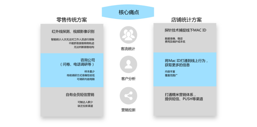 联铺客流统计在众多的零售业态背景下,使用WIFI智能感应技术,对线下客流进行了全方位的分析。并与实体零售专家联手打造,寻找零售业通用、关键的经营指标,打造产品订制化模型,从零售商关注的整场客流及趋势统计,到零售门店到店顾客区分, 从顾客关注的零售业态通用六大品类(服装、饰品、鞋履、箱包、个护美容、家电)品牌偏好,到顾客来源的任意时间段分析,实现了从传统单纯统计维度到统计与分析一体的转变,深入洞察客户及品牌,对顾客调研、品牌招商、反向营销、阶段性营销活动监测、全年运营方案制定均提供了新的解决方案,以科技、用数据赋能广大实体零售商户。